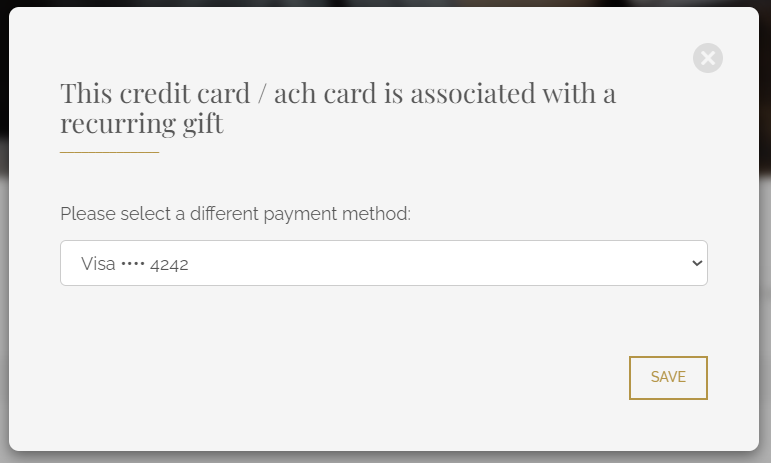 - If this payment method is connected to a recurring gift, a window will pop up to inform you of this and ask you to select a different payment method. Click the drop-down arrow to the right of the payment method field, select your new payment method, and click save.