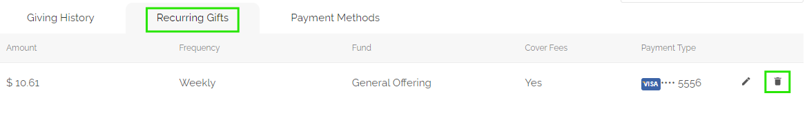 If you would like to stop a recurring gift, from the Giving tab in your profile, select the Recurring Gifts tab and click the trash can icon to the right of your donation listing.