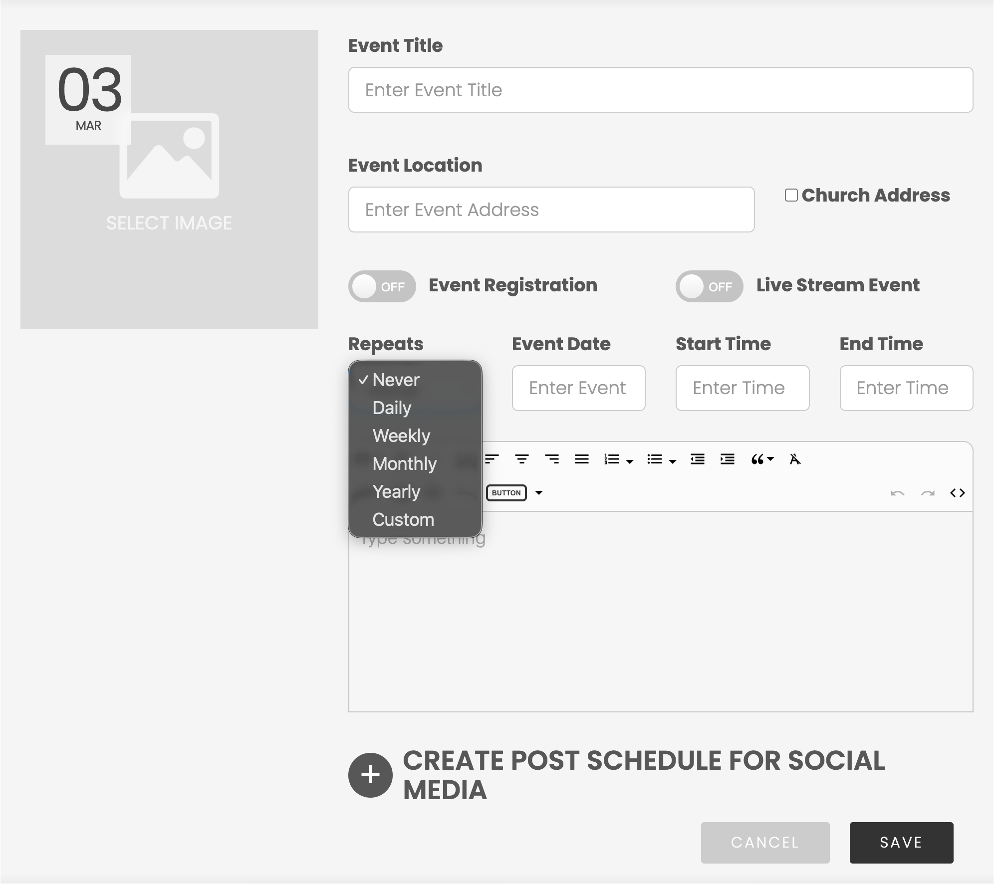 - Event Date and Time - Besides choosing the Event Date from the pop-up calendar and setting the Start Time/End Time, you have the option to create the event to be recurring. The “Repeats” option is used for events that happen at a regular time every day, week, month, or year.