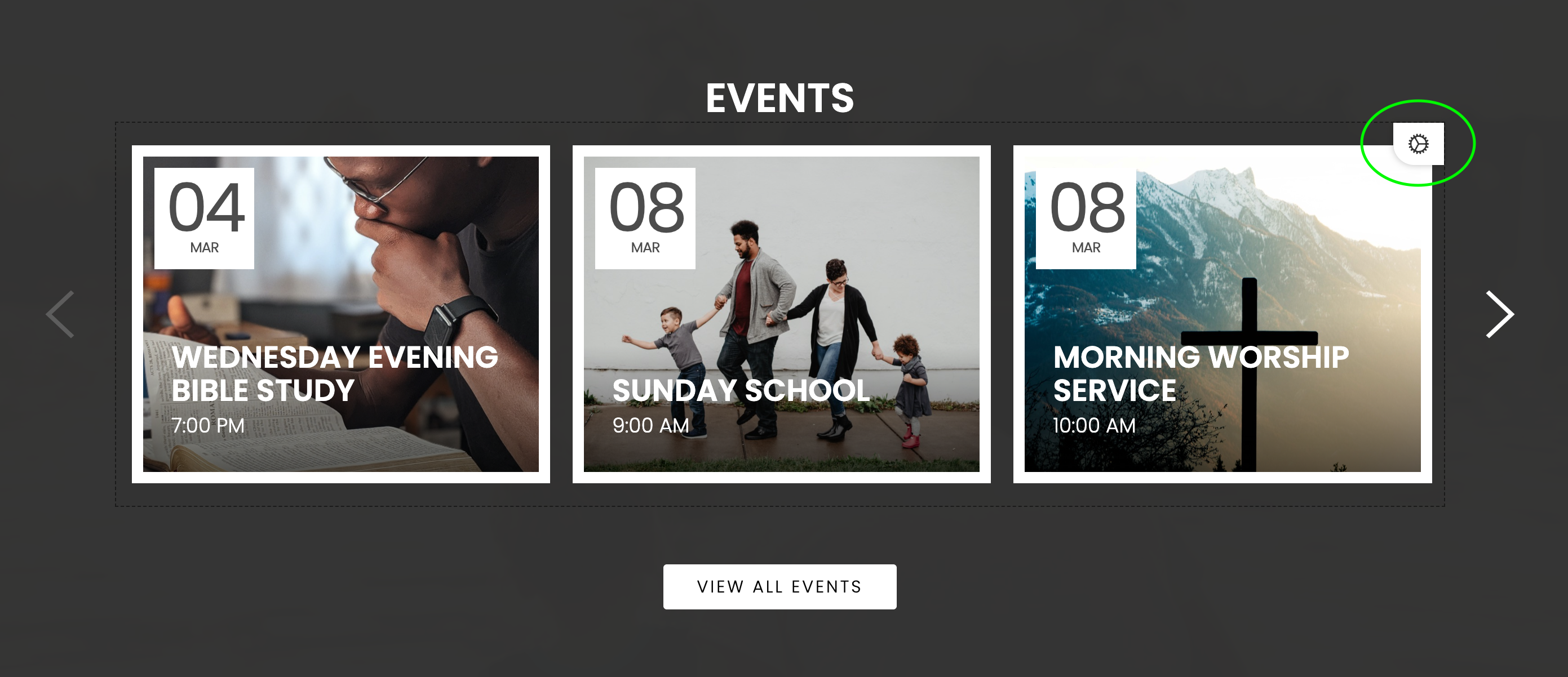 The Blocks feature contains an Events Carousel template that you can place on any page of your website. If you have more than one Events page setup within your website, you can click on the Settings icon in the top right corner of the carousel and select the Event page you want to reflect in the blocks event carousel.