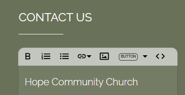 - Contact Info - This is a listing of the church/ministry name. phone number and address. Our system draws this info from the Settings>Profile section of your website, but you can also edit it within the footer area. Consistent NAP (Name, Address, Phone) information in the footer of every webpage can support local SEO efforts. Some search engines, like Google, may use this information to populate knowledge panels or local business listings.